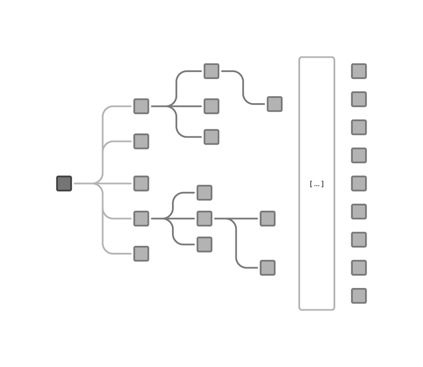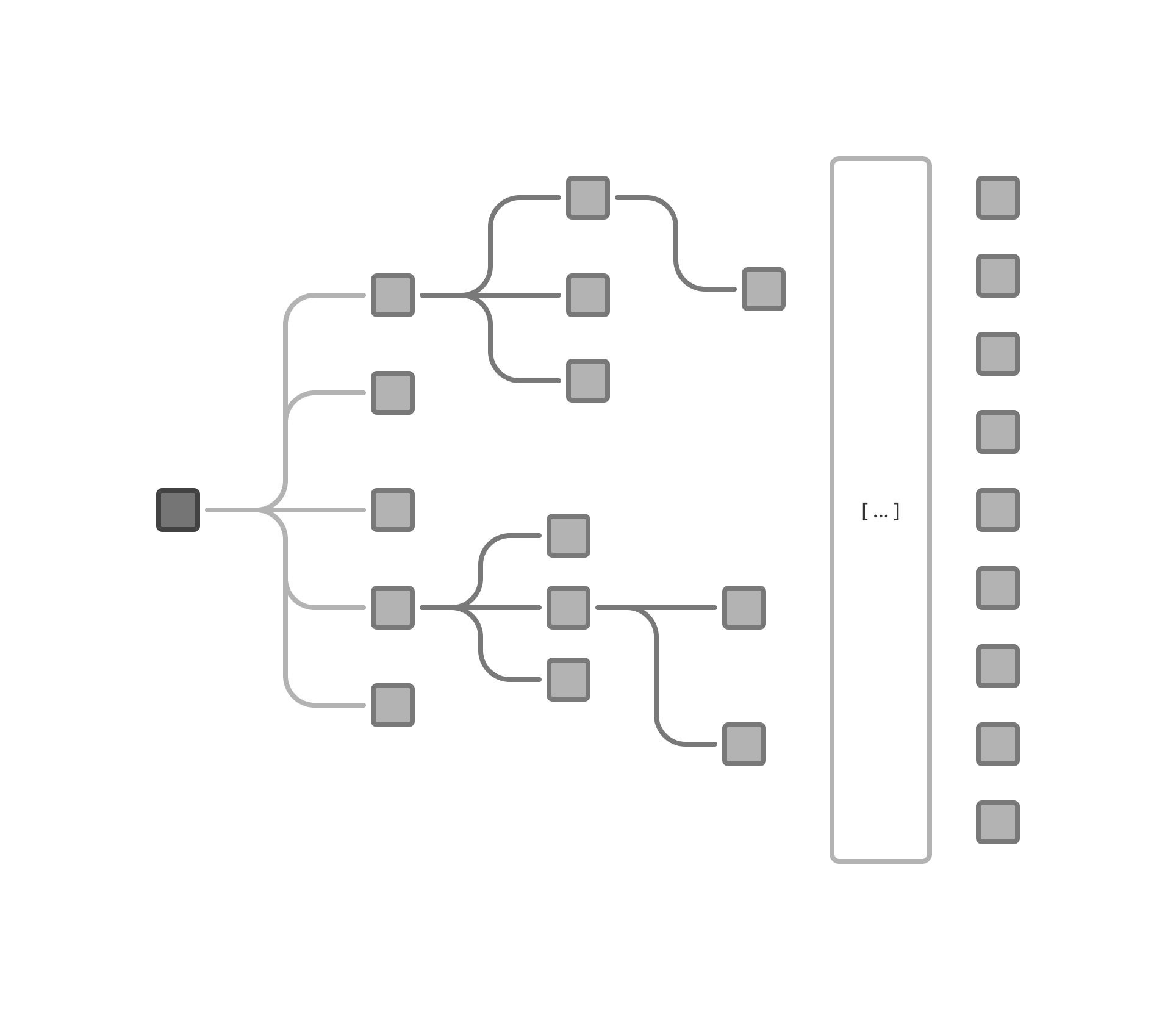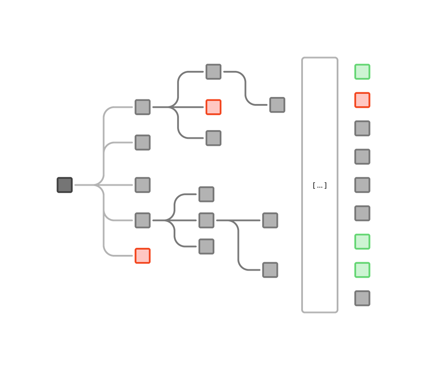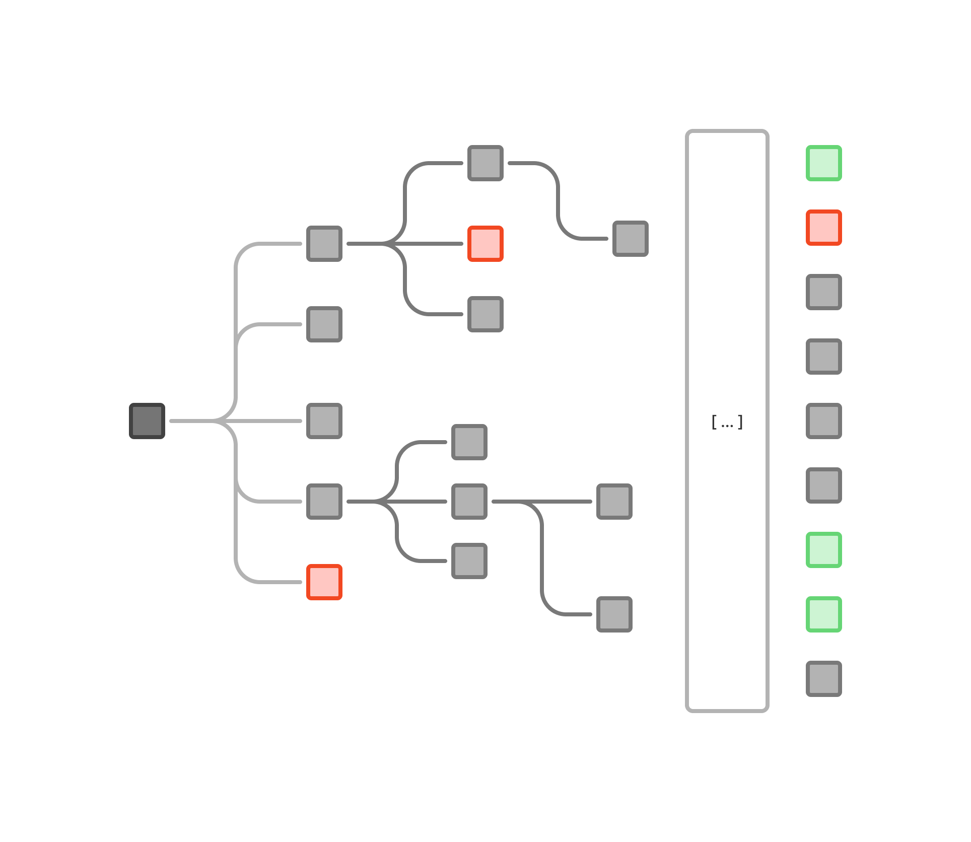 Where do we start? First, we don’t need to cover all the paths (we can’t anyways) but want enough examples to cover the decision nodes. We also want the examples to be diverse and represent various preceding context C so we will end up wanting let’s say 10 examples per node1. About 338K examples in total to get +99% coverage.
