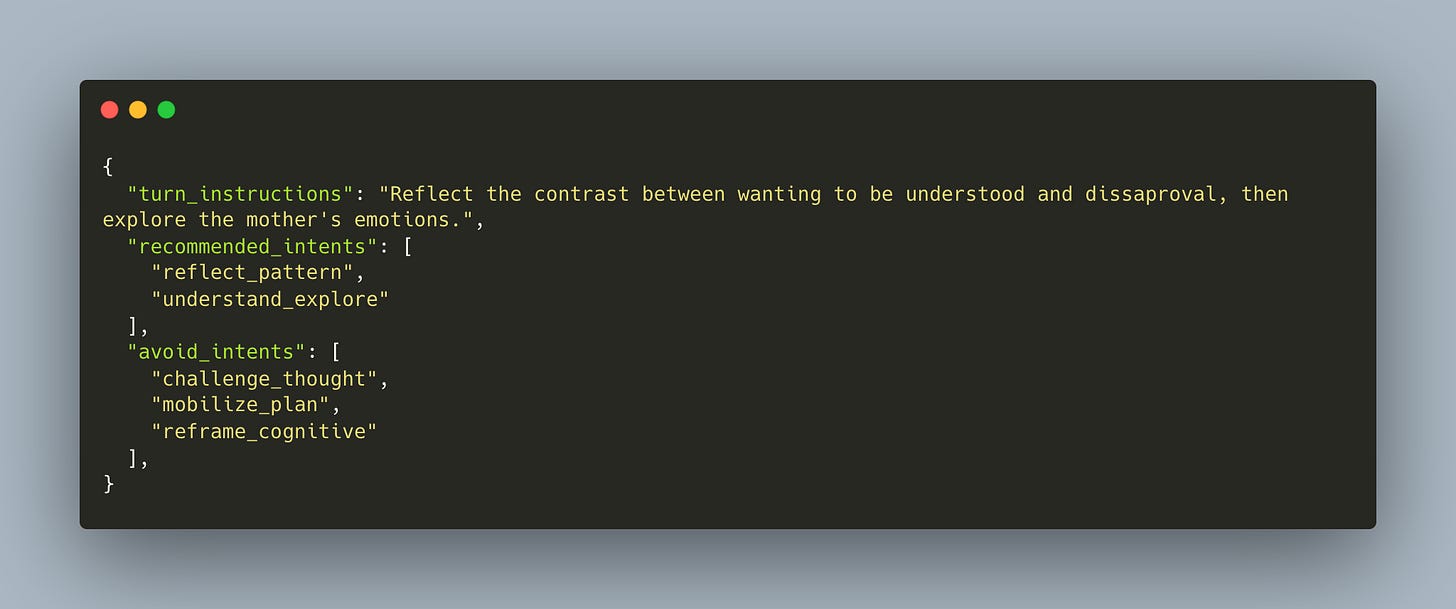 We can also assume we won’t consider every intent at every turn. There is an aspect of phase-appropriateness here where using the connect_welcome intent as the session is coming to a close or using encourage_hope three messages into the session simply doesn’t make sense.