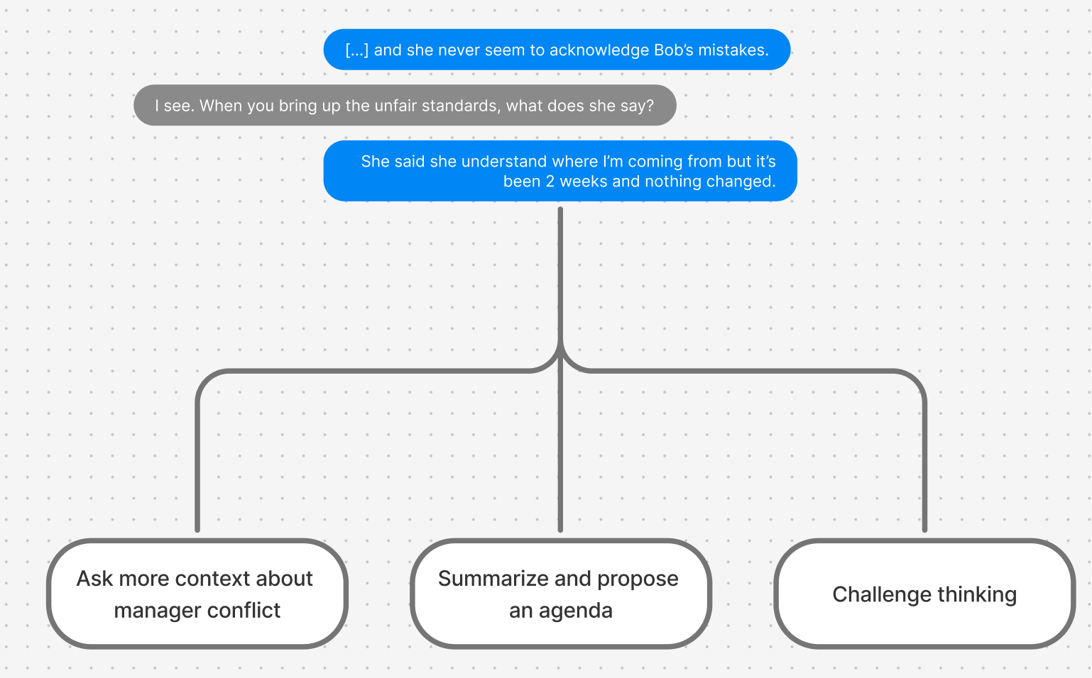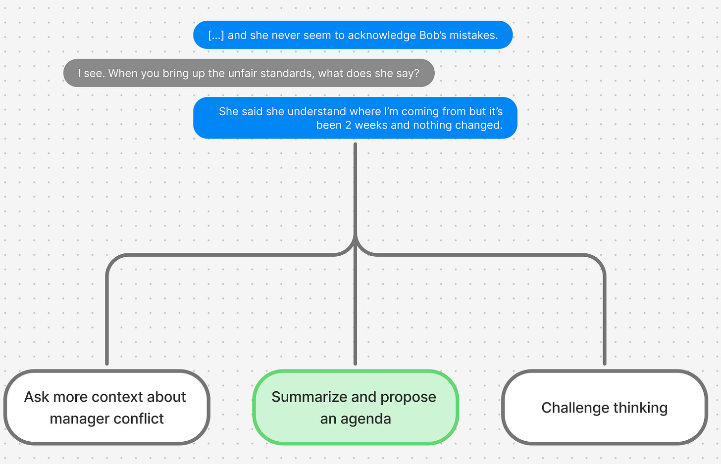 In this example, we’re early into the session and we’ve been uncovering what’s bothering the user. We do not yet have explicit buy-in from them on the core issue they’d like to work through and the end state they wish to reach. This helps make the right decision a bit more clear.